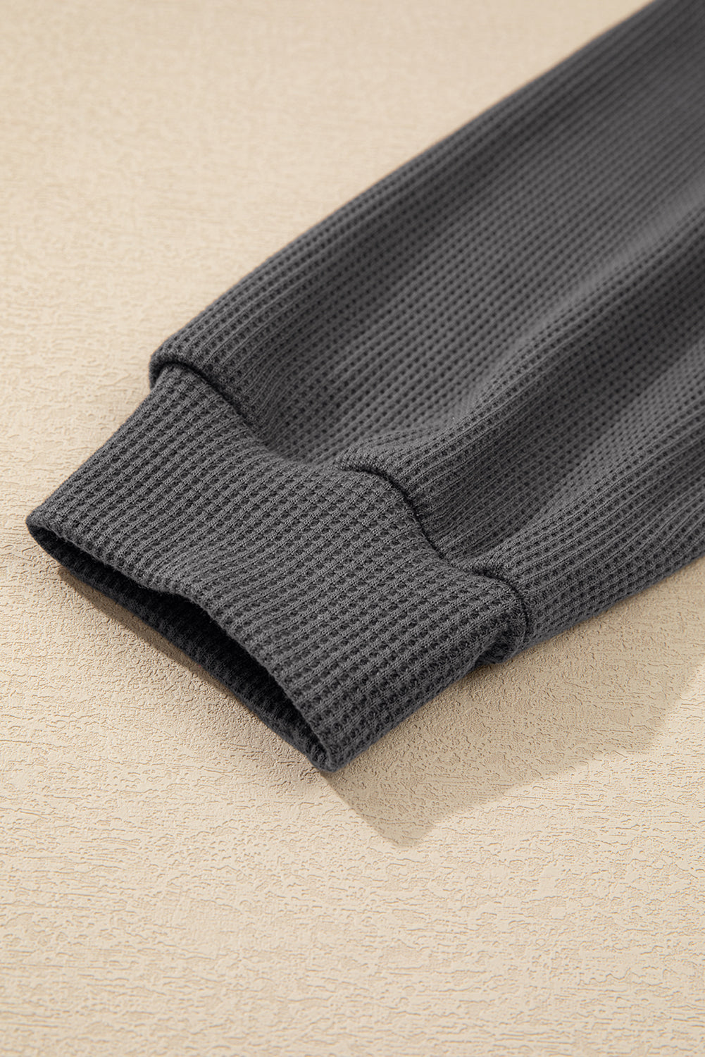 Dark Grey Waffle Colorblock Buttons Placket Drop Shoulder Drawstring Hoodie