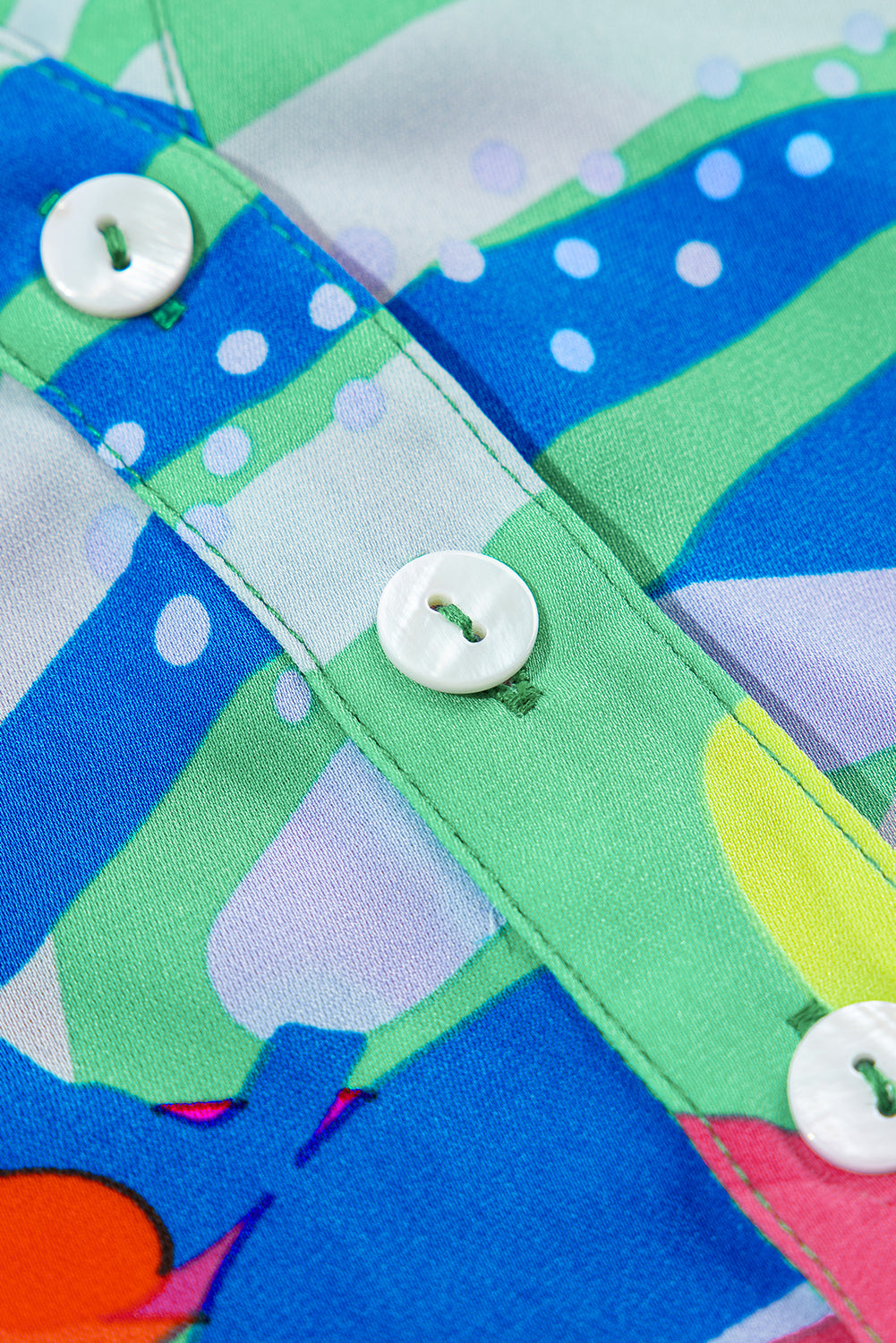 - The blouse is a stylish piece that combines artistic patterns with elegant design.