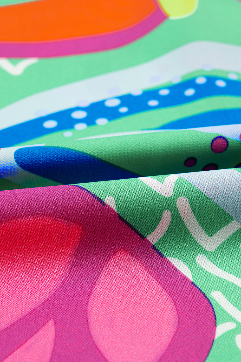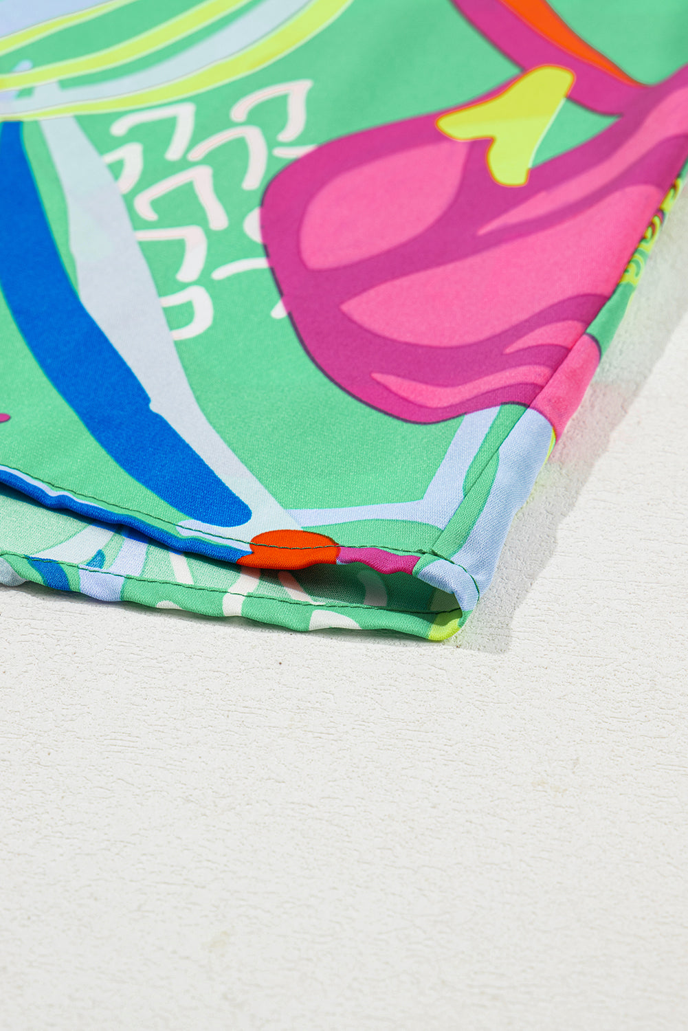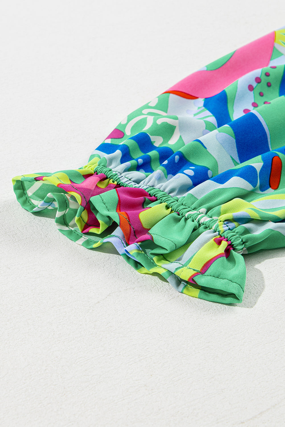 Green Abstract Printed Flounce Sleeve V Neck Buttoned Plus Size Blouse