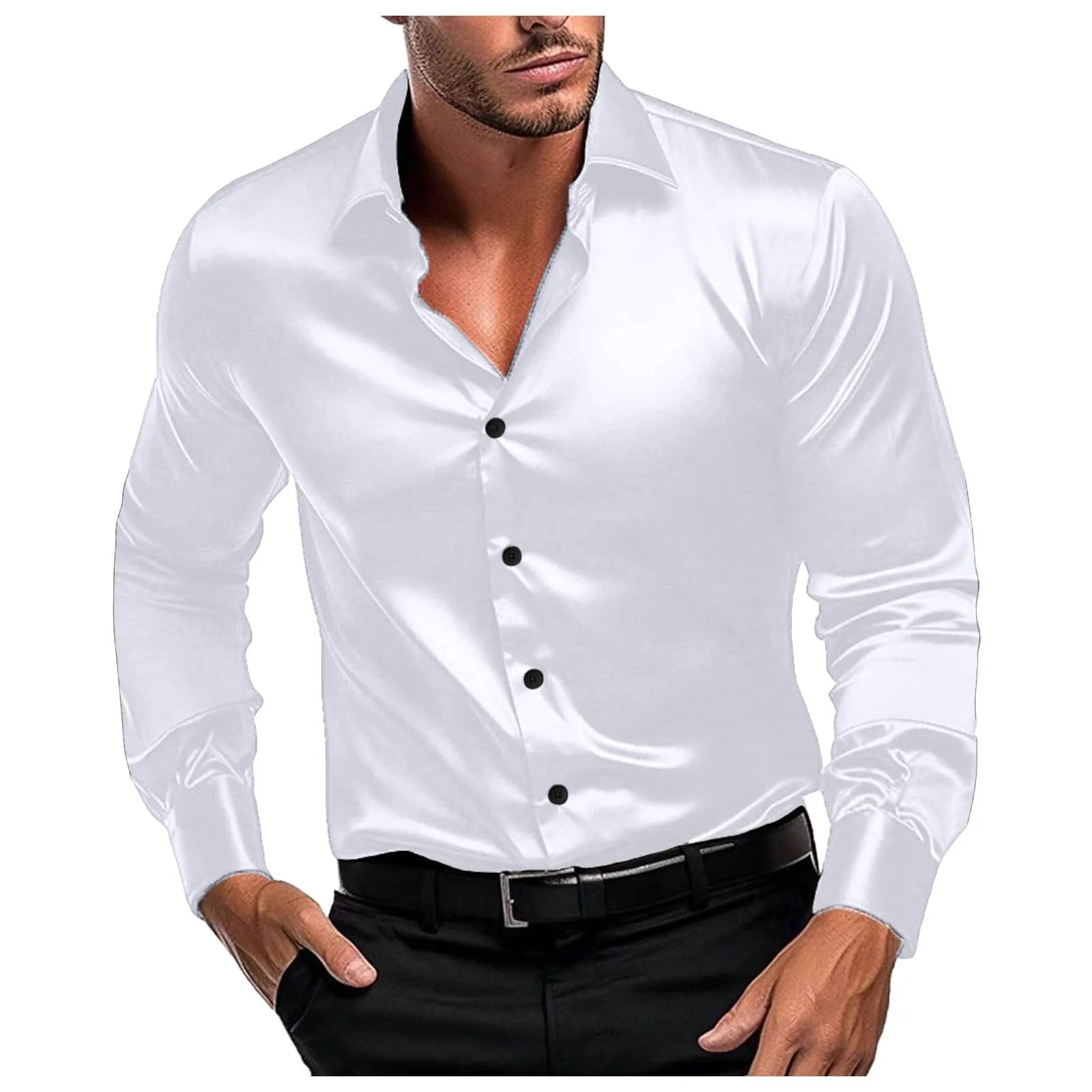 Men's Black Satin Shirt Stretch Wrinkle Formal Wedding Prom Long Sleeve Dress Shirt Casual Bussiness Slim Fit Button Down Shirts