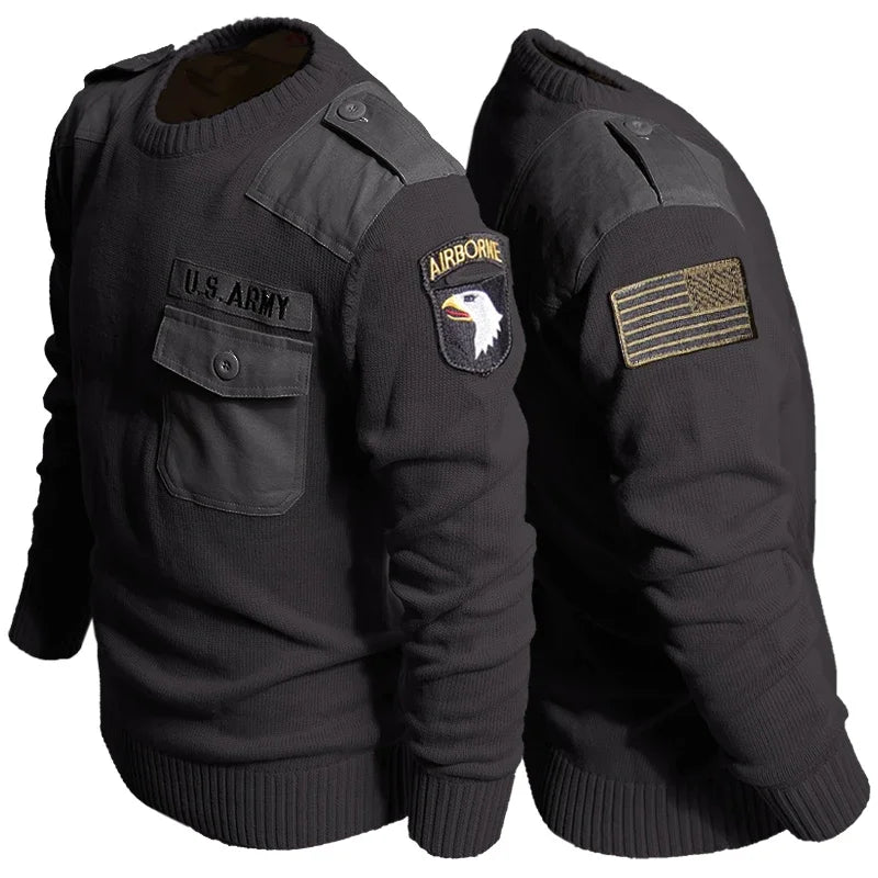 Retro Tactical Turtleneck Knitted Sweater Men Letter Pattern Patchwork Cotton Jumper Outdoor Hiking Loose Military Pullover Male